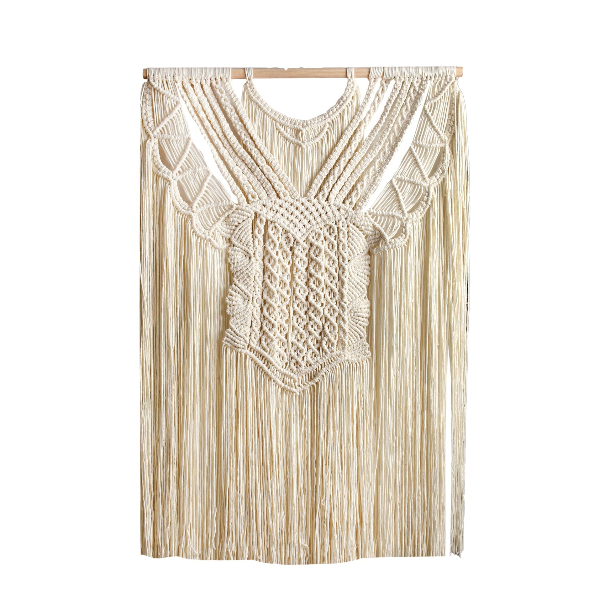 The Heylen Wall Hanging is a striking statement piece for modern and bohemian interiors alike. Crafted from premium hand knitted wool, it showcases layered macramé knotting with intricate detailing and a bold geometric layout. Its cascading fringes add texture and softness, making it a versatile wall décor accent for both minimal and eclectic spaces.